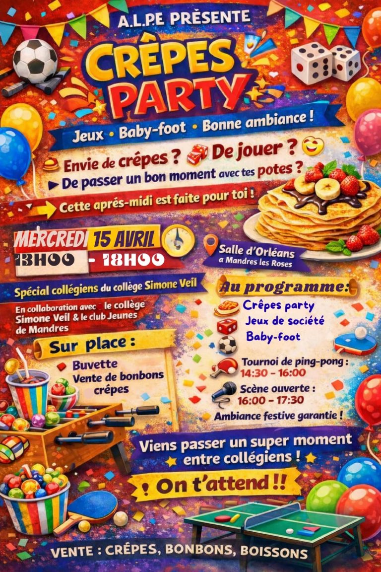 L’association A.L.P.E organise une Crêpes Party le mercredi 15 avril, de 13h00 à 18h00, à la salle d’Orléans, en collaboration avec le collège Simone Veil et le club jeunes. Au programme : jeux, baby-foot, tournoi de ping-pong et scène ouverte, le tout dans une ambiance conviviale. Sur place : crêpes,
