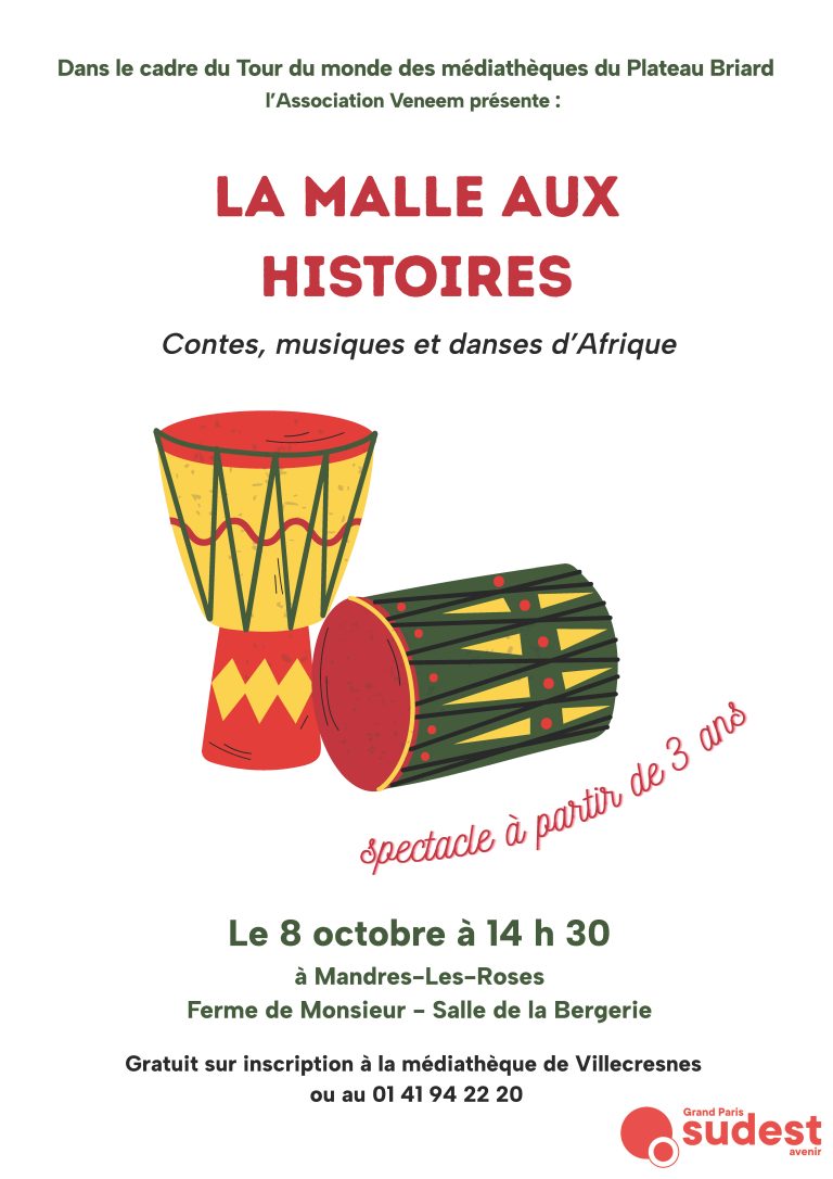 Mardi 8 octobre à 14h30, dans le cadre du Tour du monde des médiathèques du Plateau Briard, l’association Veneem propose La Malle aux histoires, un spectacle coloré de contes, musiques et danses d’Afrique. Destiné aux enfants dès 3 ans, mais aussi pour les adultes, ce spectacle gratuit invite à découvrir