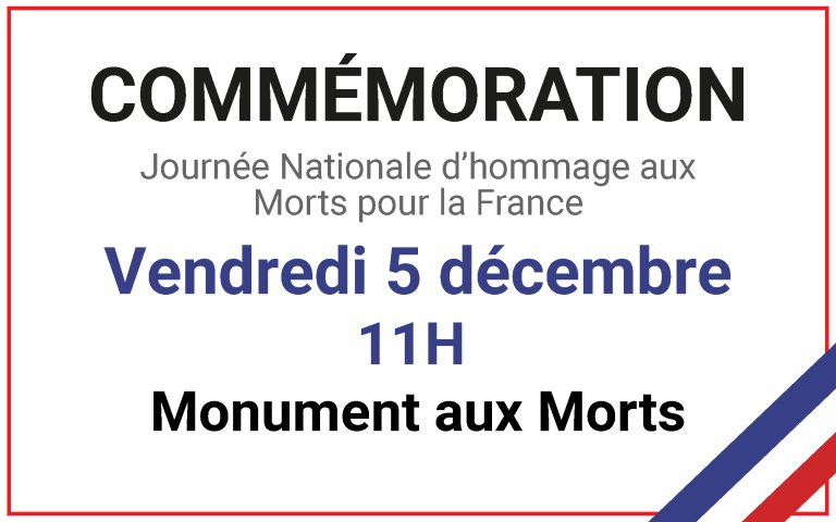 À la Une Commémoration du 5 décembre 2025 La journée nationale d’hommage aux Morts pour la France pendant la guerre d’Algérie et des combats du Maroc et de la Tunisie aura lieu à 11H.