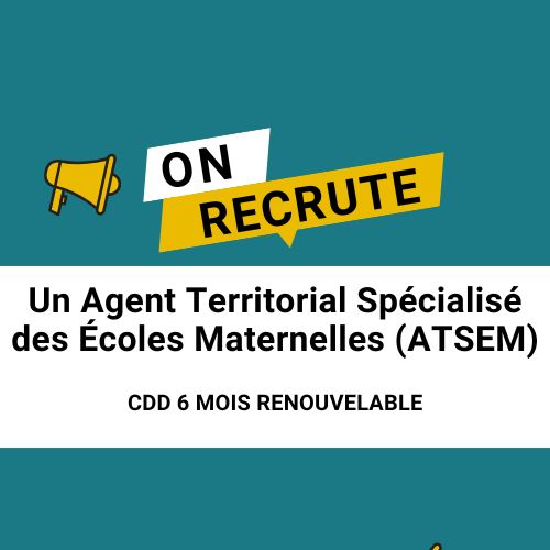 À la Une La ville recrute un Agent Territorial Spécialisé des Écoles Maternelles (ATSEM) La Ville recrute par voie contractuelle un Agent Territorial Spécialisé des Écoles Maternelles (ATSEM).