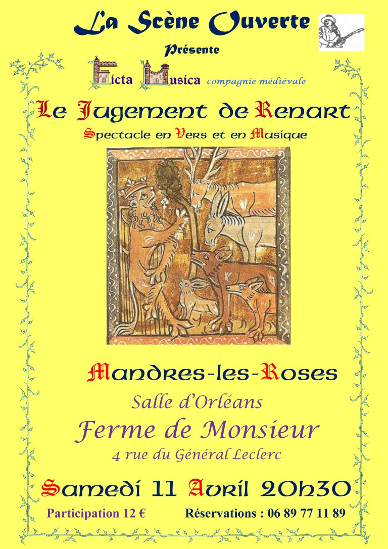 La Scène Ouverte vous convie le samedi 11 avril à 20h30 dans la salle d’Orléans pour une soirée exceptionnelle. La compagnie Ficta Musica, spécialisée dans la musique médiévale, présentera son spectacle « Le Jugement de Renart ». Informations pratiques : Entrée : 12 € Réservation : 06 89 77 11