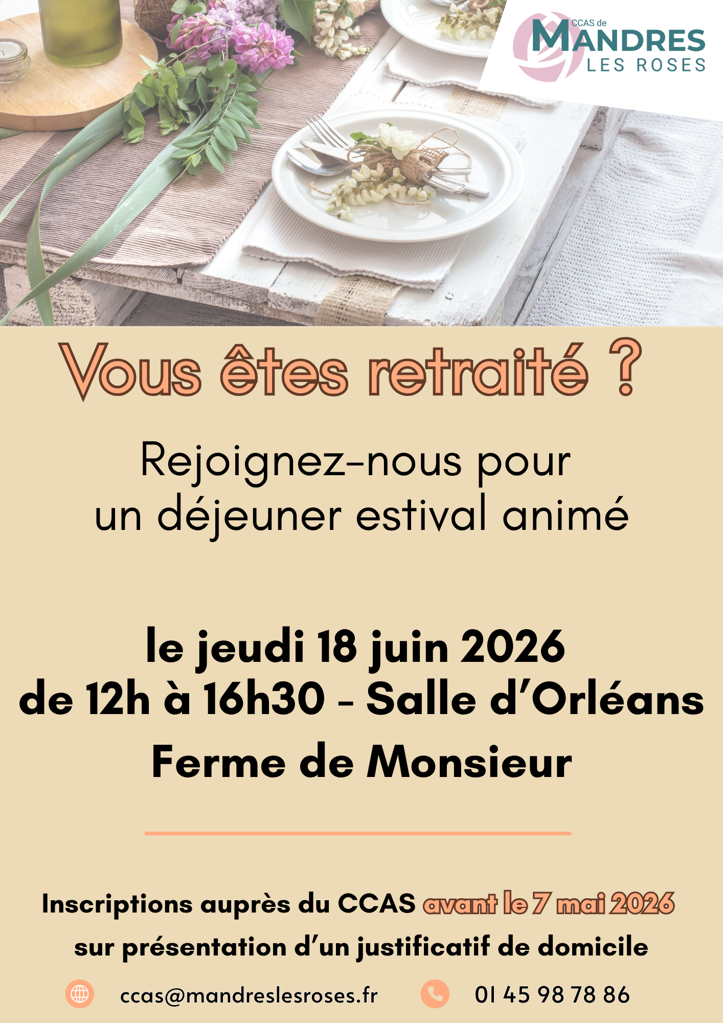 Rejoignez-nous pour un déjeuner estival animé le jeudi 18 juin 2026 de 12h à 16h30 – Salle d’Orléans Ferme de Monsieur.