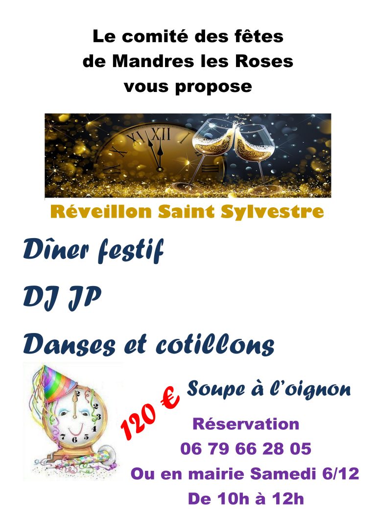 Le Comité des Fêtes de Mandres-les-Roses vous invite à célébrer la Saint-Sylvestre autour d’un dîner festif animé par DJ JP, avec danses et cotillons pour terminer l’année en beauté. Informations pratiques : Réservation obligatoire : 06 79 66 28 05 Ou directement en mairie : samedi 6 décembre de 10h